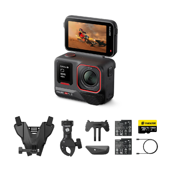 Equípate y sal a la carretera. El paquete de moto incluye 1x Insta360 Ace Pro 2, 1x antiviento (preinstalado por defecto), 2x baterías, 1x montura estándar, 1x capuchón de micrófono, 1x cable USB-C, 1x tarjeta microSD de 128 GB, 1x montura para mentón de casco 2.0 y 1x montura de pinza ultra-resistente. |